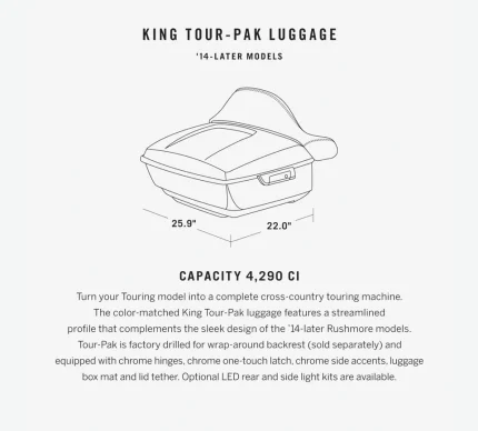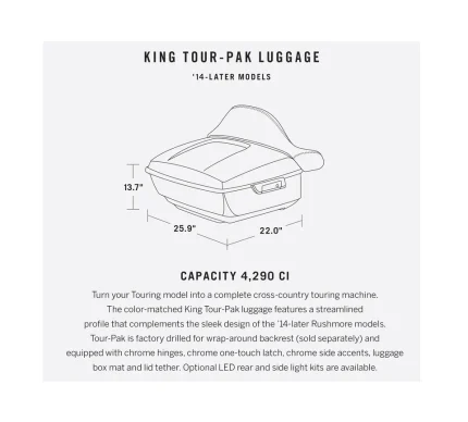 Our HOGWORKZ® King Tour Pack is the big daddy of tour packs! It’s the quickest way of adding additional storage to your ’97 & up Harley-Davidson®! Gain tons of added storage for your helmets, jackets, rain gear, and whatever else you may need for those long journeys. Painted to matchyour bike’s color and complete with full passenger backrest and chrome premium lid/latch & lock hardware! Installation of the King Tour Pack is quick and easy with our mounting bracket.