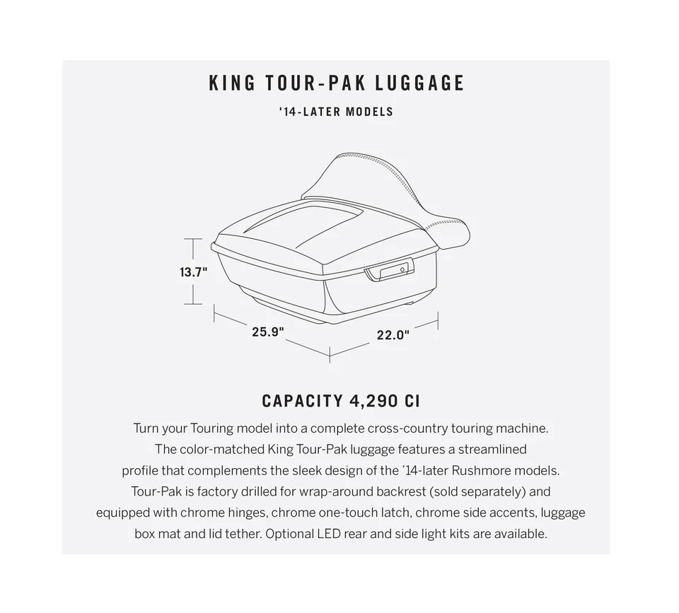 Turn your Touring model into a complete cross-country touring machine. The color-matched King Tour-Pak luggage features a streamlined profile that complements the sleek design of the ’14-later Touring models. Tour-Pak is factory drilled for wrap-around backrest (sold separately) and equipped with chrome hinges, chrome one-touch latch, chrome side accents, luggage box mat and lid tether. Optional LED rear and side light kits are available.
